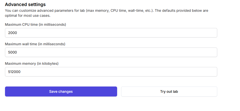 Under Advanced Settings, you can fine-tune your lab’s execution limits.