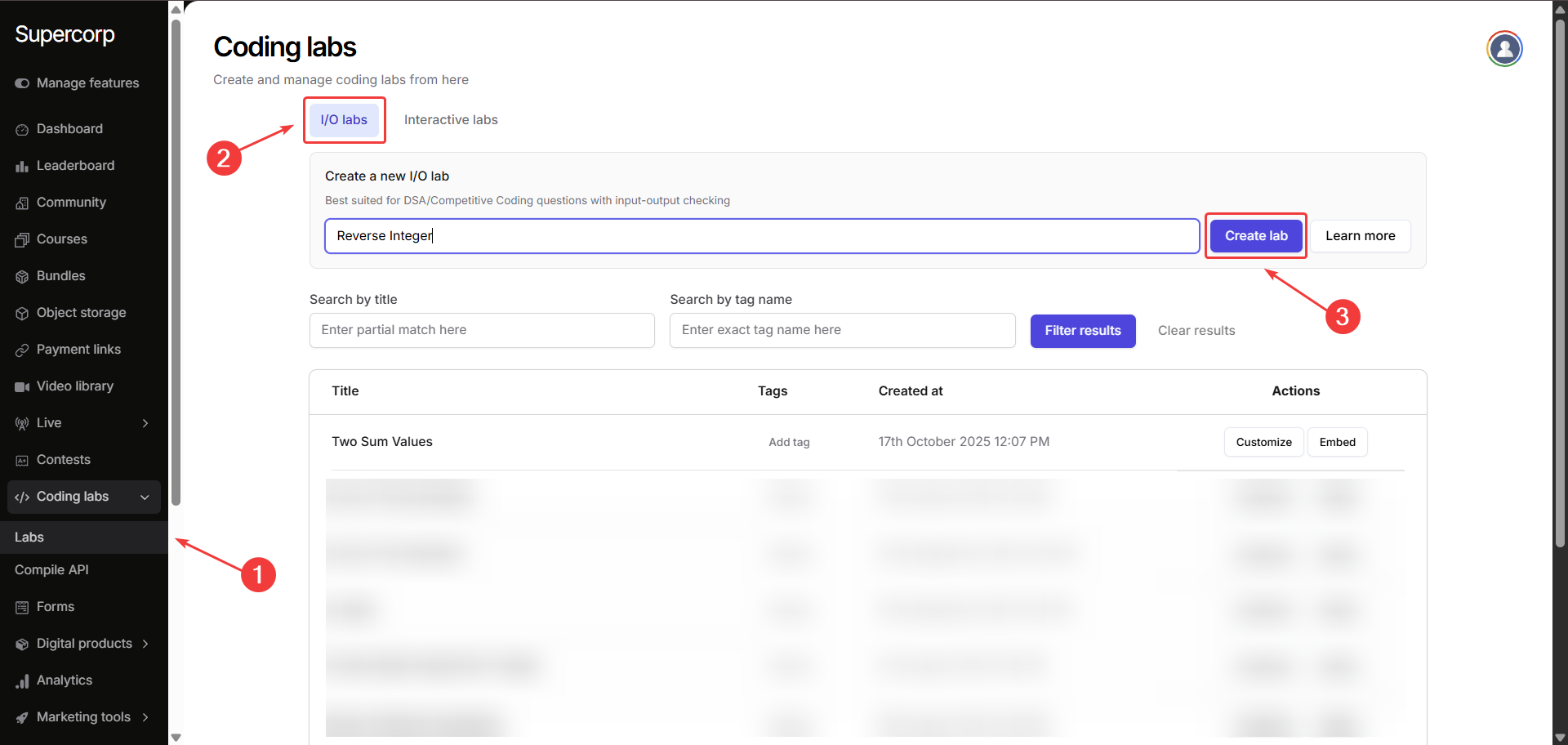 To access IO Coding Labs, go to your Instructor Dashboard and open the Coding Labs section from the sidebar. Click on Labs and then navigate to the IO Coding Labs tab.