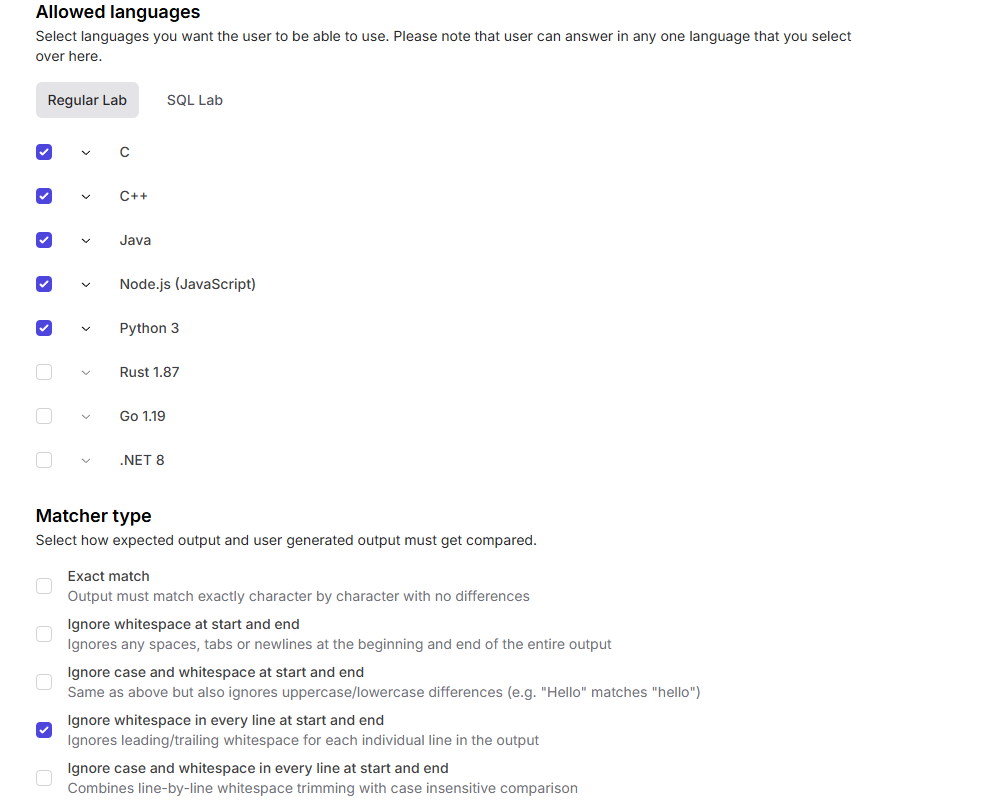 Under Matcher Type, decide how the system should compare user output with the expected output:
